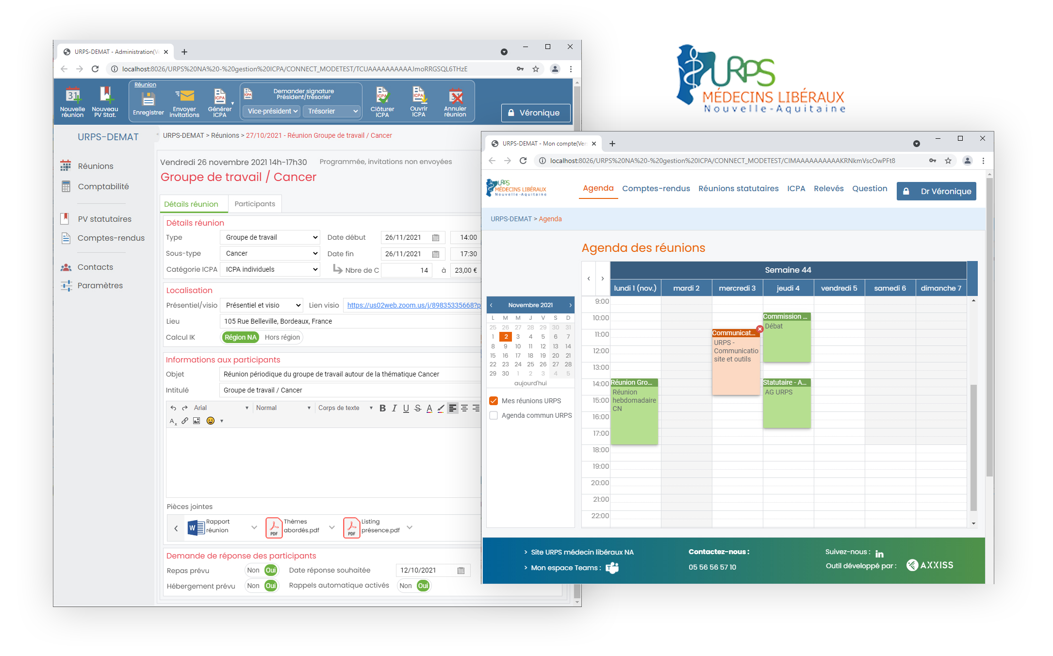 Administration des réunions par le staff de l’URPS, liaison avec l’environnement Outlook 365, encodage des comptes-rendus par les médecins participants, calculs automatisés des indemnités pour les participants, gestion des signatures électroniques des documents d’indemnité, gestion de la comptabilité,…